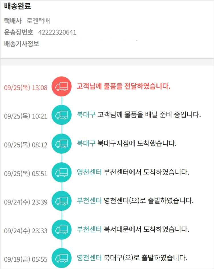 기부자님이 사용한 기부포인트 11,400원, 물품배송비 6,500원, 가격상승분 2,500원, 100원 미만 지원금 70원, 결제 수수료 10,405원, 기타 사업비는 행복나눔재단이 부담했습니다. (기부후기 발송시점에 최종 업데이트 됩니다.) 실제 쇼핑몰에서 확인되는 배송현황을 캡처한 내용입니다. 실시간 자료와는 차이가 있을 수 있습니다.