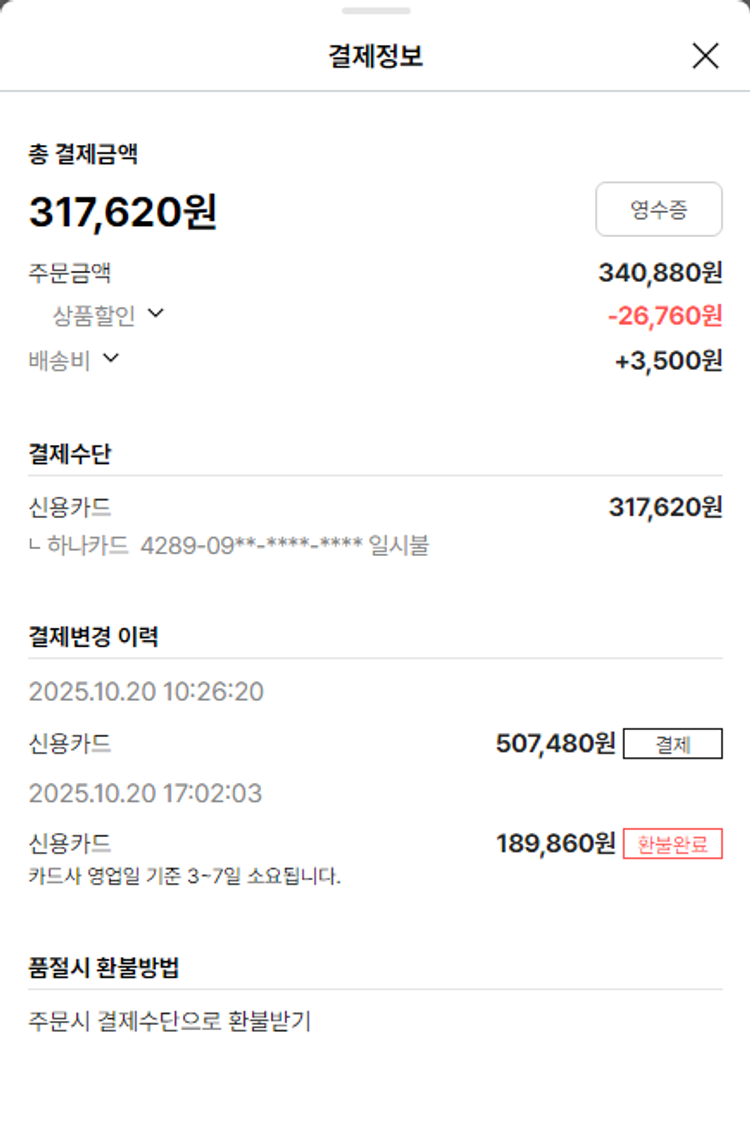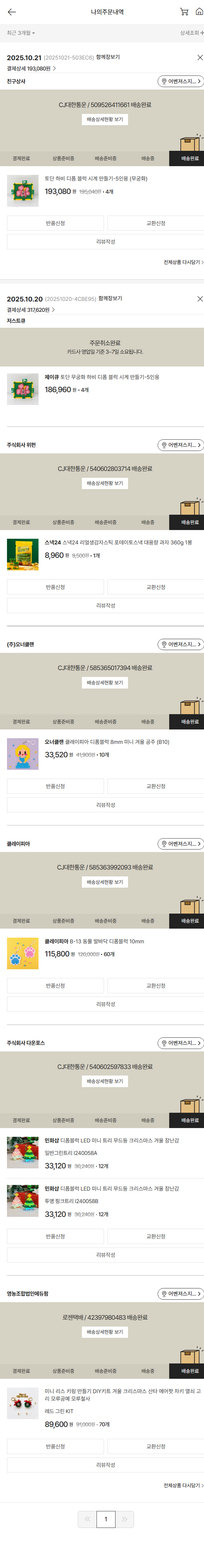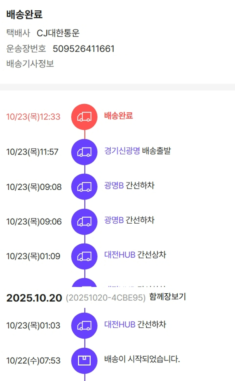 물품배송비 3,500원, 가격상승분 14,980원, 100원 미만 지원금 20원, 기타 사업비는 행복나눔재단이 부담했습니다. (기부후기 발송시점에 최종 업데이트 됩니다.) 상품 주문 건 중 품절 발생하여 2025-10-21 재주문하였습니다. 실제 쇼핑몰에서 확인되는 배송현황을 캡처한 내용입니다. 실시간 자료와는 차이가 있을 수 있습니다.