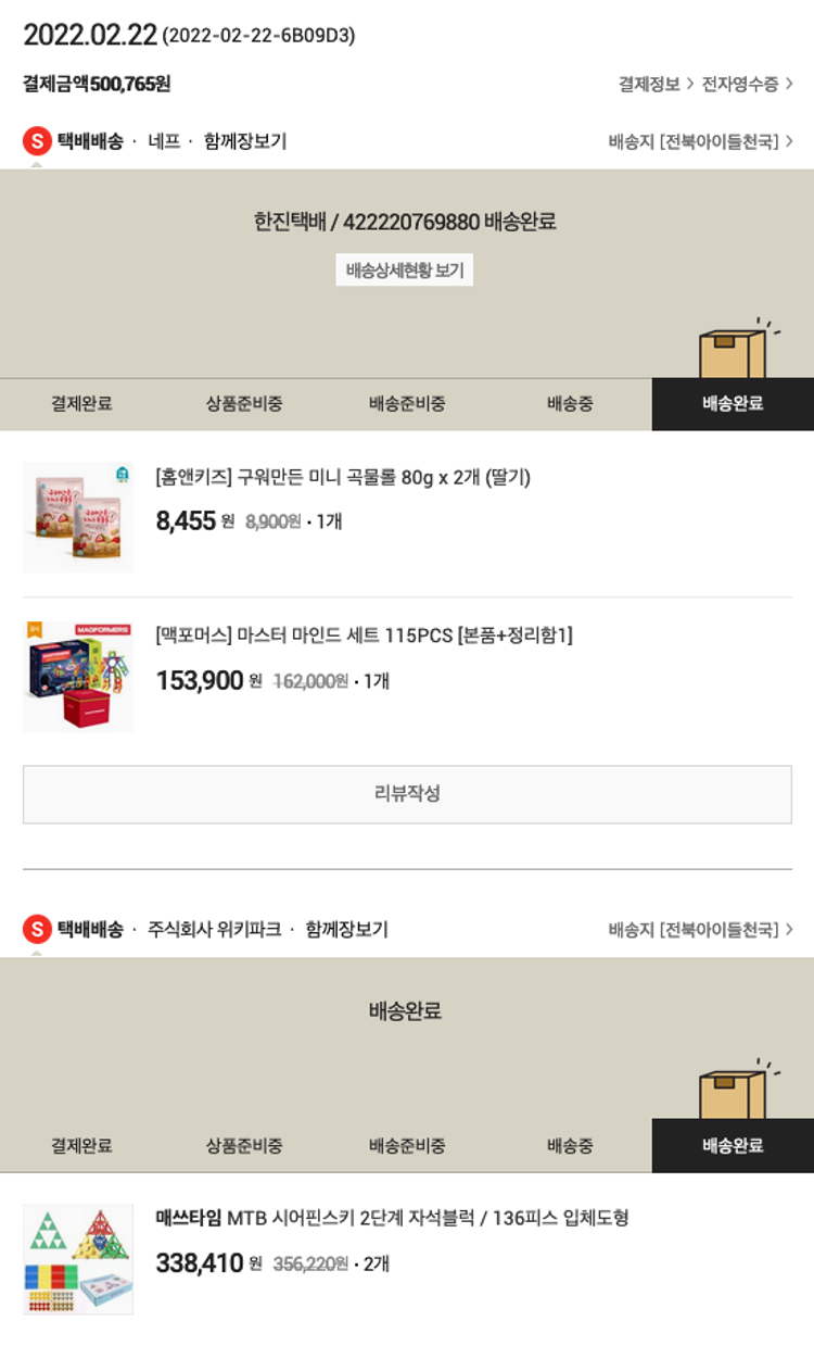 가격상승분 1,805원, 100원 미만 지원금 60원, 결제 수수료 10,975원, 기타 사업비는 행복나눔재단이 부담했습니다. (기부후기 발송시점에 최종 업데이트 됩니다.) 실제 쇼핑몰에서 확인되는 배송현황을 캡처한 내용입니다. 실시간 자료와는 차이가 있을 수 있습니다.