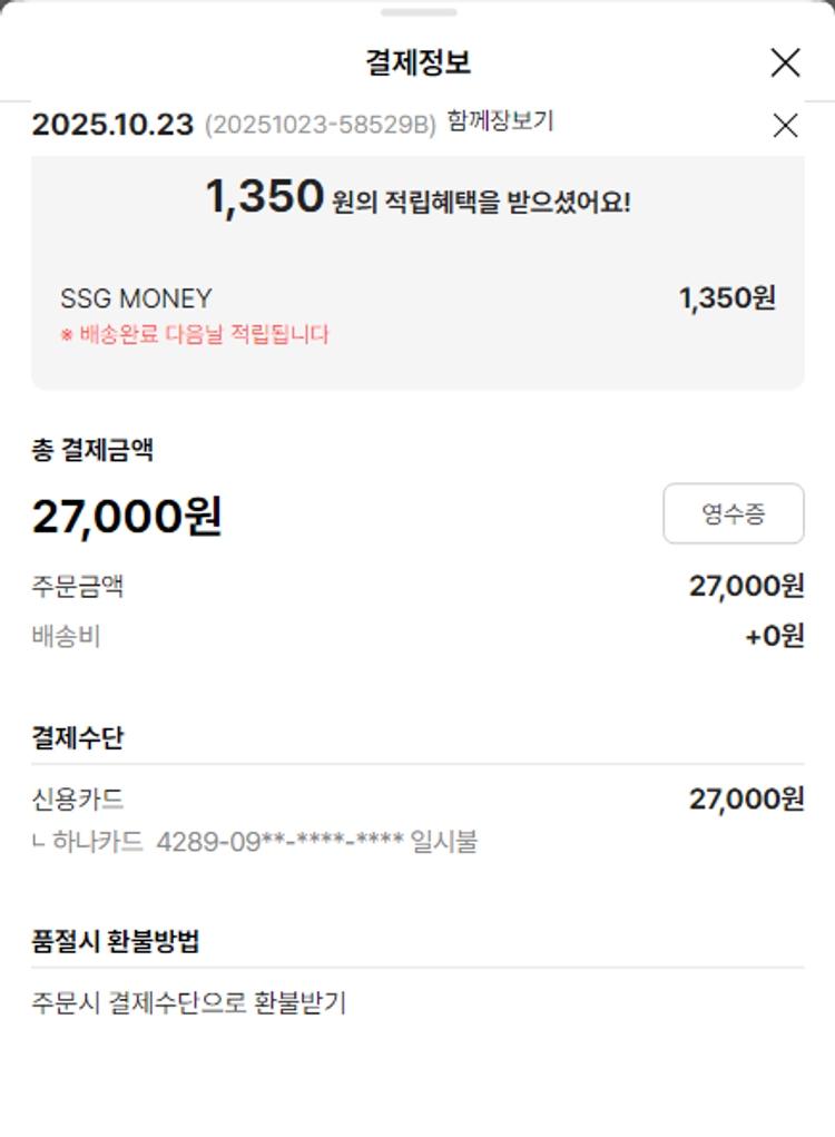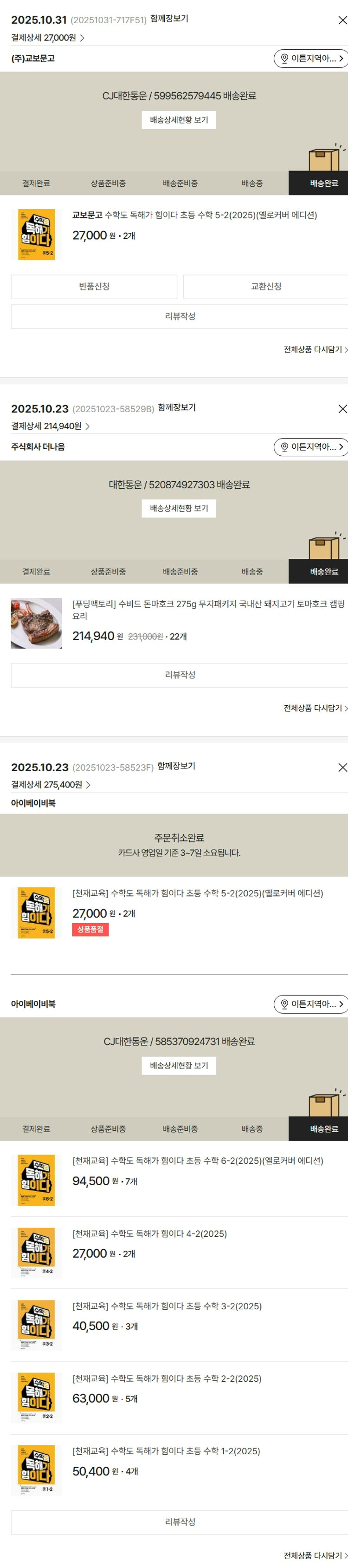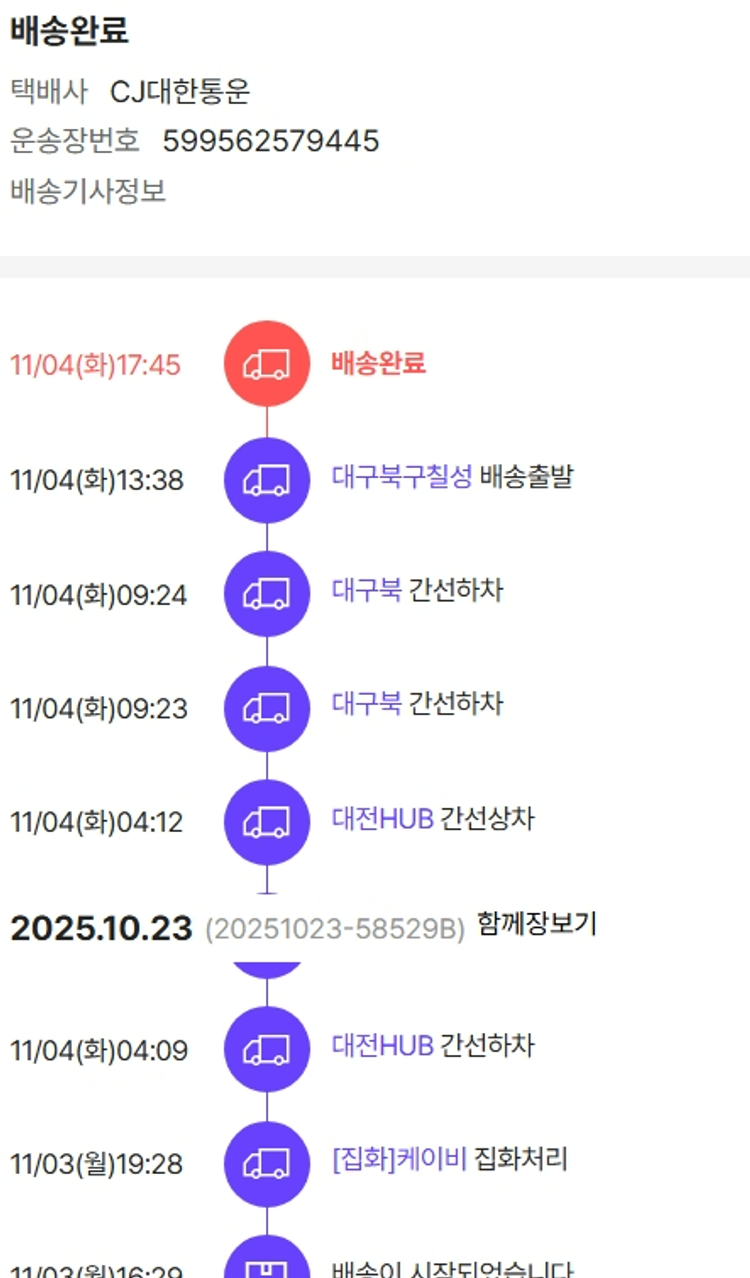 가격상승분 17,440원, 기타 사업비는 행복나눔재단이 부담했습니다. (기부후기 발송시점에 최종 업데이트 됩니다.) 상품 주문 건 중 품절 발생하여 2025-10-31 재주문하였습니다. 실제 쇼핑몰에서 확인되는 배송현황을 캡처한 내용입니다. 실시간 자료와는 차이가 있을 수 있습니다.