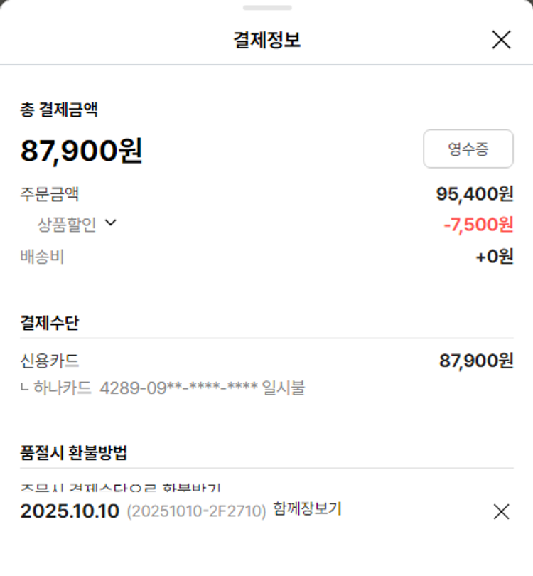 기부자님이 사용한 기부포인트 8,000원, 가격상승분 8,800원, 100원 미만 지원금 40원, 결제 수수료 11,415원, 기타 사업비는 행복나눔재단이 부담했습니다. (기부후기 발송시점에 최종 업데이트 됩니다.) 상품 주문 건 중 품절 발생하여 2025-10-20 재주문하였습니다. 실제 쇼핑몰에서 확인되는 배송현황을 캡처한 내용입니다. 실시간 자료와는 차이가 있을 수 있습니다.