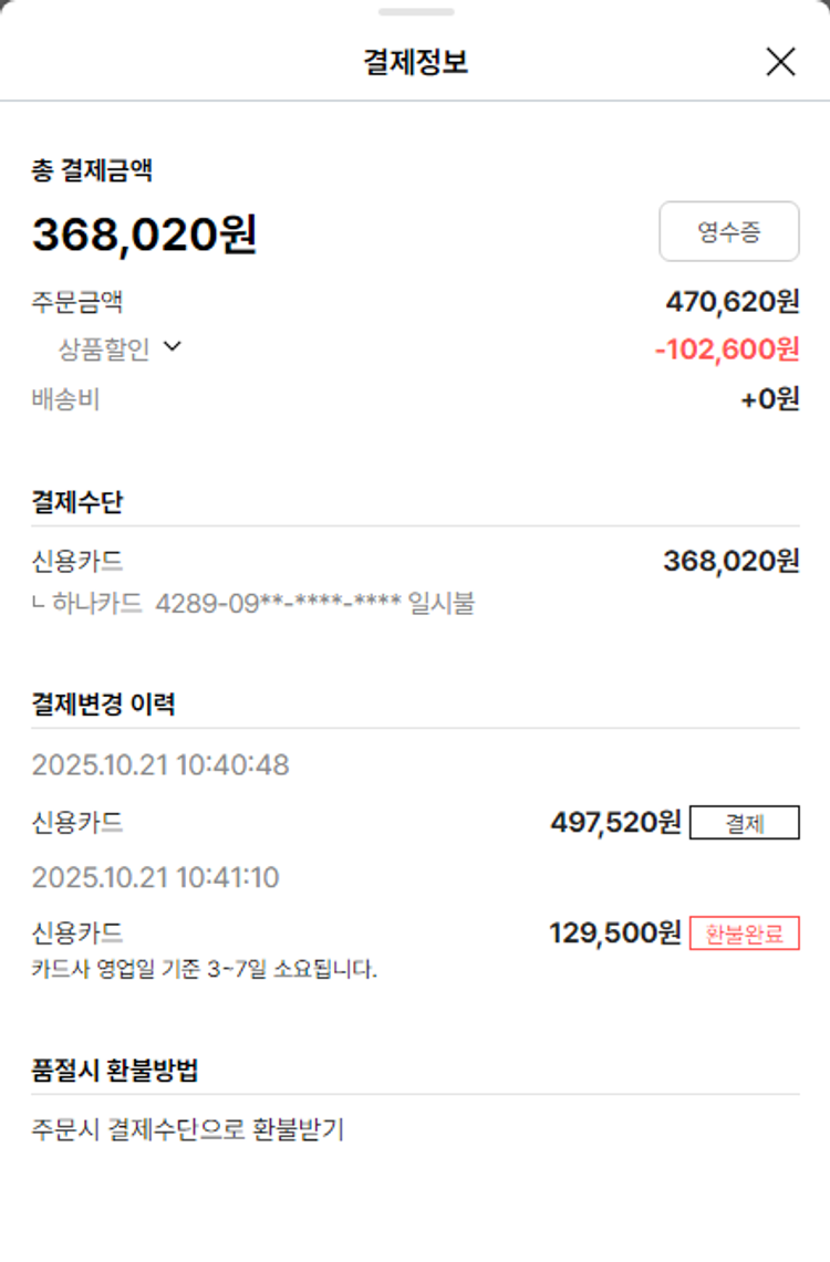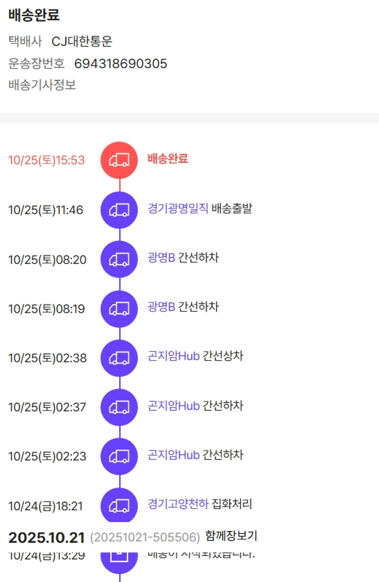 기부자님이 사용한 기부포인트 11,000원, 물품배송비 3,000원, 가격상승분 14,705원, 100원 미만 지원금 95원, 결제 수수료 11,064원, 기타 사업비는 행복나눔재단이 부담했습니다. (기부후기 발송시점에 최종 업데이트 됩니다.) 상품 주문 건 중 품절 발생하여 2025-10-22 재주문하였습니다. 실제 쇼핑몰에서 확인되는 배송현황을 캡처한 내용입니다. 실시간 자료와는 차이가 있을 수 있습니다.