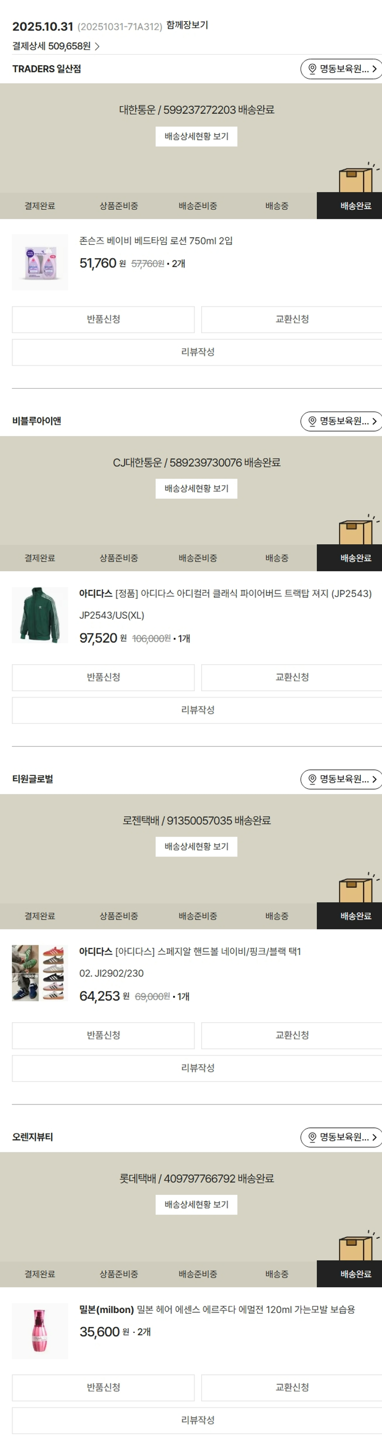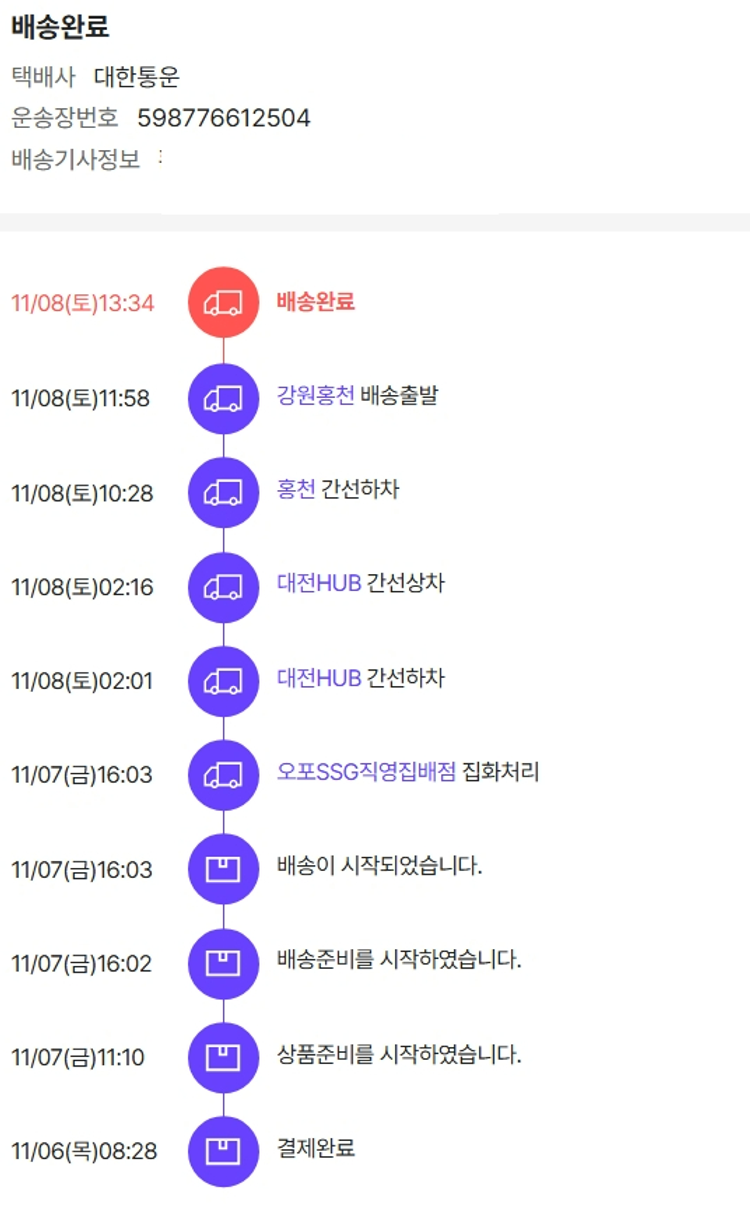 기부자님이 사용한 기부포인트 8,000원, 물품배송비 13,000원, 가격상승분 2,818원, 100원 미만 지원금 90원, 결제 수수료 13,928원, 기타 사업비는 행복나눔재단이 부담했습니다. (기부후기 발송시점에 최종 업데이트 됩니다.) 상품 주문 건 중 품절 발생하여 2025-11-06 재주문하였습니다. 실제 쇼핑몰에서 확인되는 배송현황을 캡처한 내용입니다. 실시간 자료와는 차이가 있을 수 있습니다.