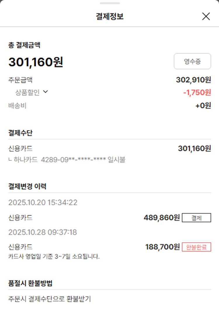 물품배송비 4,000원, 가격상승분 4,210원, 100원 미만 지원금 30원, 결제 수수료 10,768원, 기타 사업비는 행복나눔재단이 부담했습니다. (기부후기 발송시점에 최종 업데이트 됩니다.) 상품 주문 건 중 품절 발생하여 2025-10-29 재주문하였습니다. 실제 쇼핑몰에서 확인되는 배송현황을 캡처한 내용입니다. 실시간 자료와는 차이가 있을 수 있습니다.
