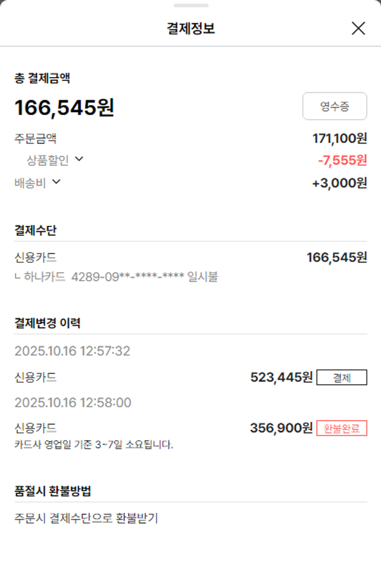 기부자님이 사용한 기부포인트 38,250원, 물품배송비 3,000원, 가격상승분 10,810원, 100원 미만 지원금 35원, 결제 수수료 11,375원, 기타 사업비는 행복나눔재단이 부담했습니다. (기부후기 발송시점에 최종 업데이트 됩니다.) 상품 주문 건 중 품절 발생하여 2025-10-16 재주문하였습니다. 실제 쇼핑몰에서 확인되는 배송현황을 캡처한 내용입니다. 실시간 자료와는 차이가 있을 수 있습니다.