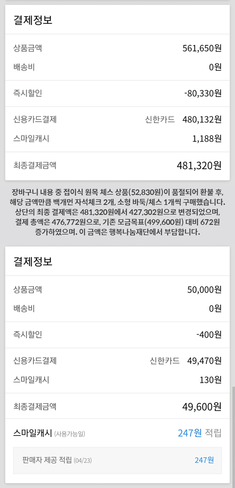 * 배송비 등 추가비용 발생시 행복나눔재단 이 부담합니다.