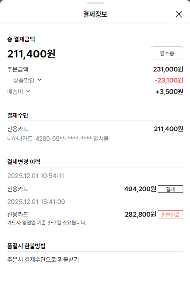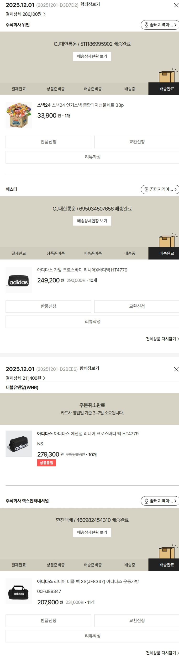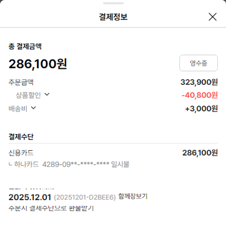 기부자님이 사용한 기부포인트 22,400원, 물품배송비 6,500원, 가격상승분 5,500원, 결제 수수료 10,625원, 기타 사업비는 행복나눔재단이 부담했습니다. (기부후기 발송시점에 최종 업데이트 됩니다.) 상품 주문 건 중 품절 발생하여 2025-12-01 재주문하였습니다. 실제 쇼핑몰에서 확인되는 배송현황을 캡처한 내용입니다. 실시간 자료와는 차이가 있을 수 있습니다.