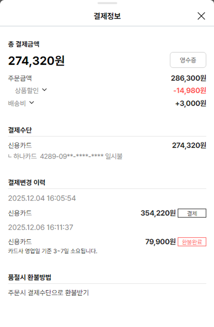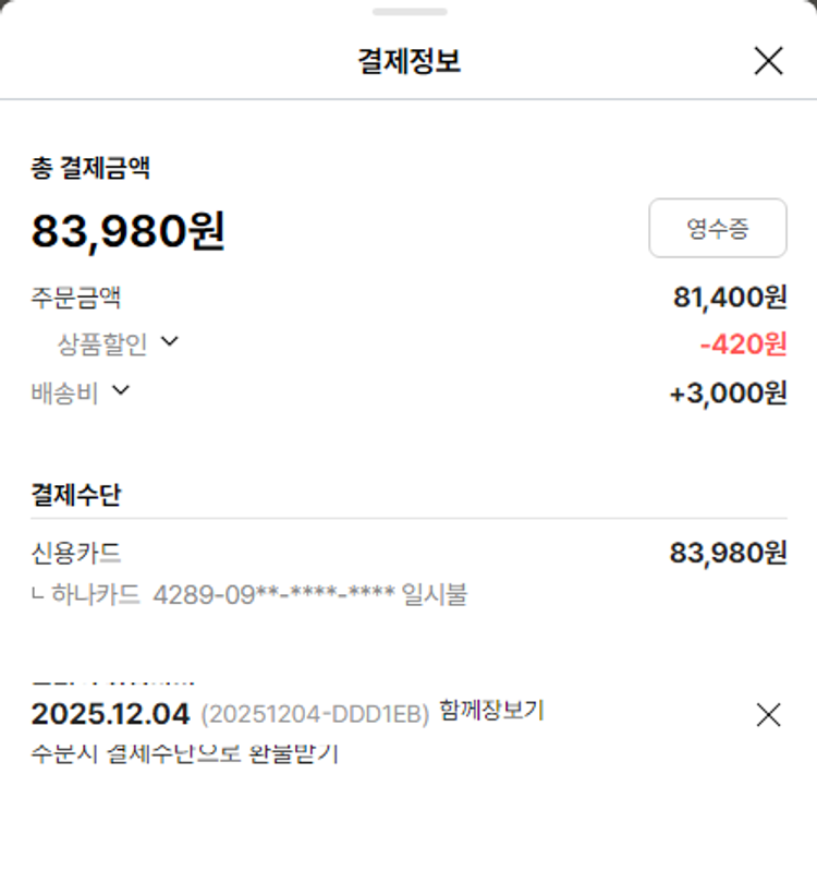 기부자님이 사용한 기부포인트 13,600원, 물품배송비 6,000원, 가격상승분 3,580원, 100원 미만 지원금 20원, 결제 수수료 10,899원, 기타 사업비는 행복나눔재단이 부담했습니다. (기부후기 발송시점에 최종 업데이트 됩니다.) 상품 주문 건 중 품절 발생하여 2025-12-08 재주문하였습니다. 실제 쇼핑몰에서 확인되는 배송현황을 캡처한 내용입니다. 실시간 자료와는 차이가 있을 수 있습니다.