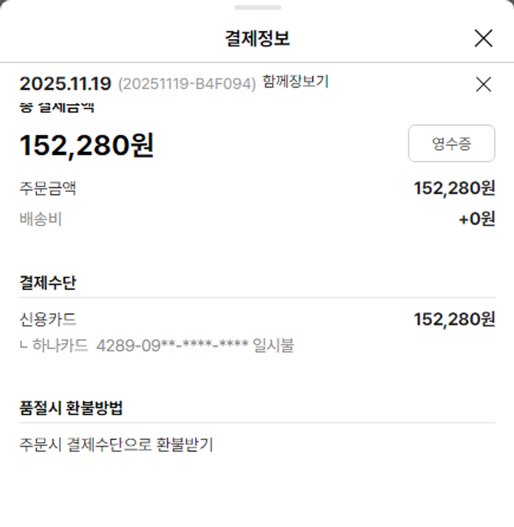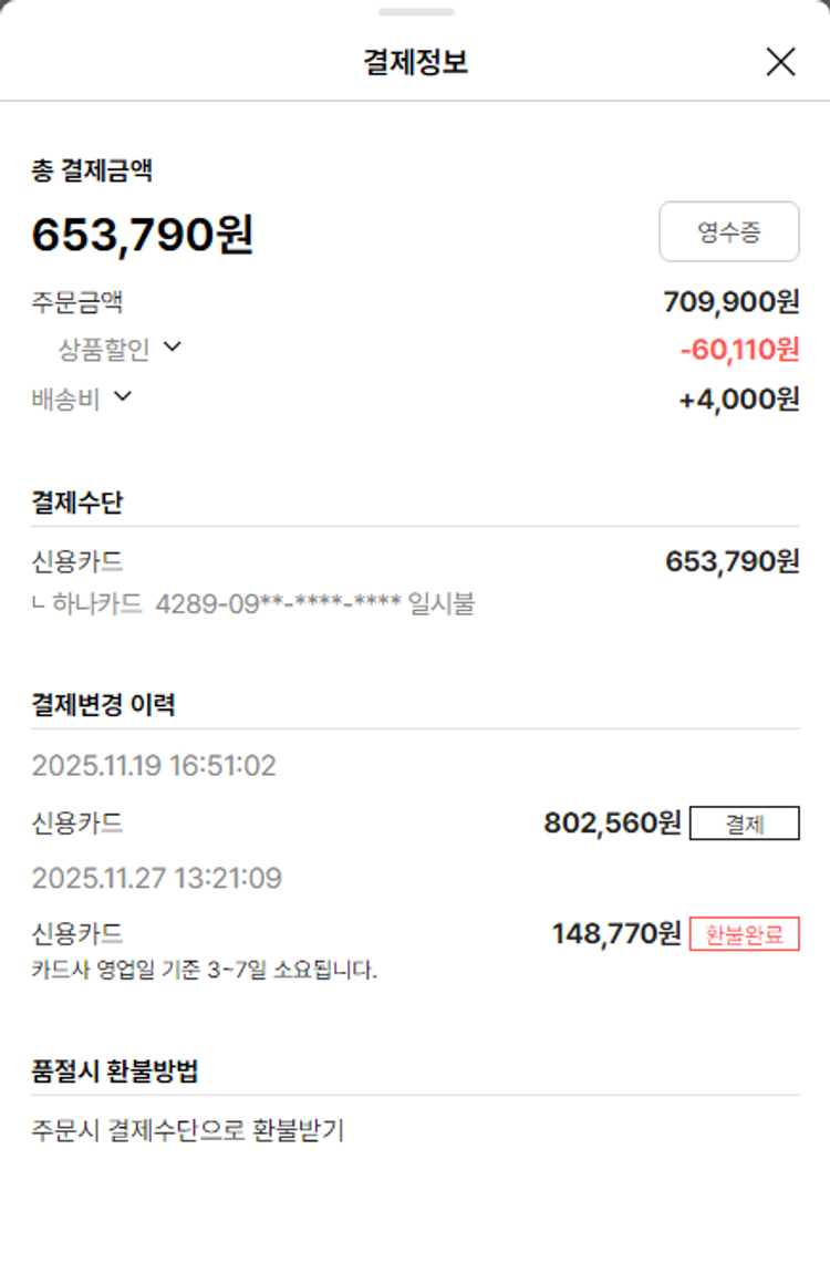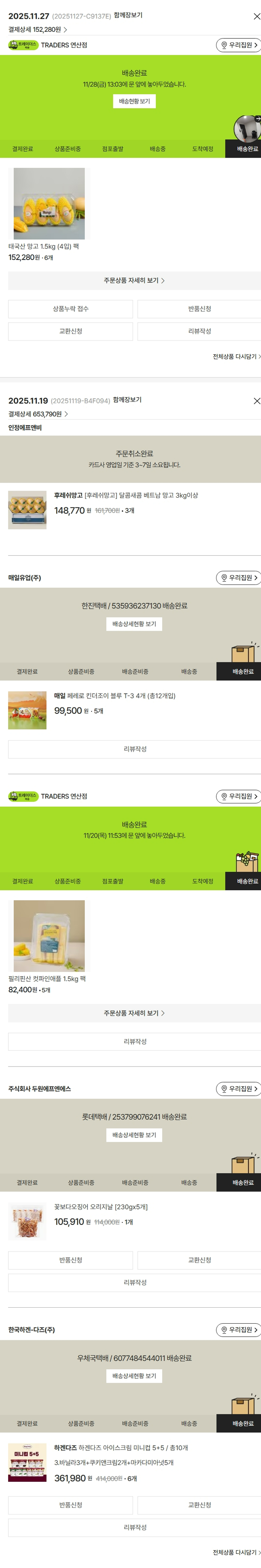 물품배송비 4,000원, 가격상승분 10,860원, 100원 미만 지원금 10원, 기타 사업비는 행복나눔재단이 부담했습니다. (기부후기 발송시점에 최종 업데이트 됩니다.) 상품 주문 건 중 품절 발생하여 2025-11-27 재주문하였습니다. 실제 쇼핑몰에서 확인되는 배송현황을 캡처한 내용입니다. 실시간 자료와는 차이가 있을 수 있습니다.