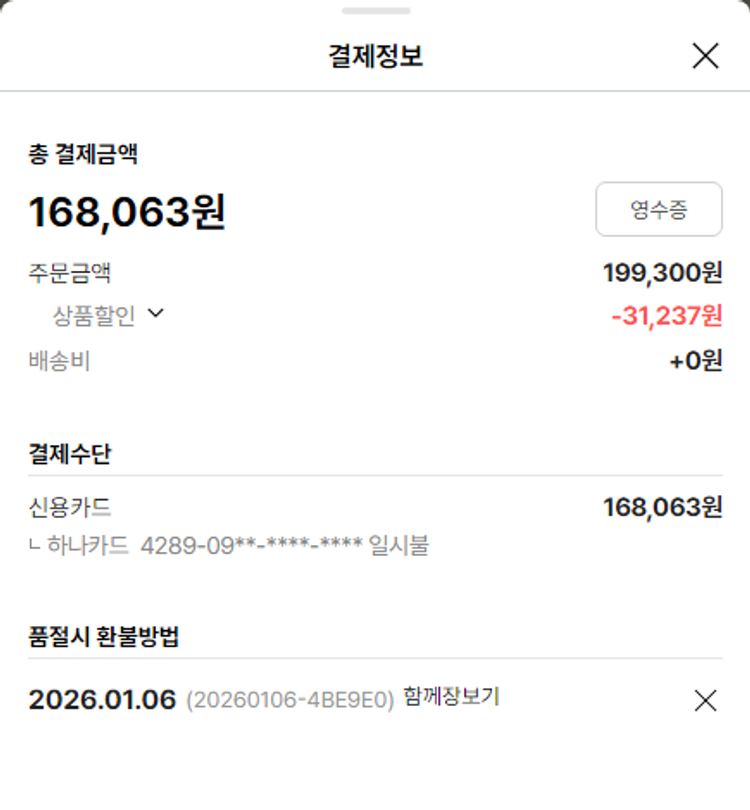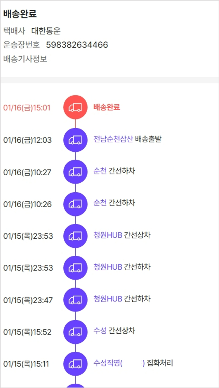 물품배송비 3,000원, 가격상승분 20,760원, 100원 미만 지원금 49원, 기타 사업비는 행복나눔재단이 부담했습니다. (기부후기 발송시점에 최종 업데이트 됩니다.) 상품 주문 건 중 품절 발생하여 2026-01-15 재주문하였습니다. 실제 쇼핑몰에서 확인되는 배송현황을 캡처한 내용입니다. 실시간 자료와는 차이가 있을 수 있습니다.