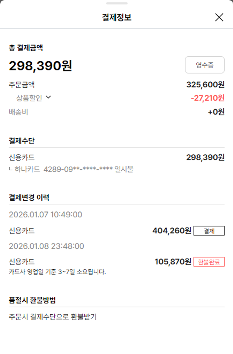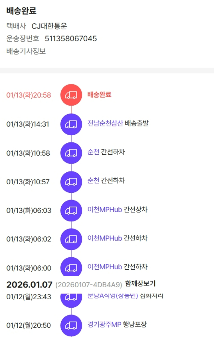 가격상승분 15,350원, 100원 미만 지원금 40원, 기타 사업비는 행복나눔재단이 부담했습니다. (기부후기 발송시점에 최종 업데이트 됩니다.) 상품 주문 건 중 품절 발생하여 2026-01-12 재주문하였습니다. 실제 쇼핑몰에서 확인되는 배송현황을 캡처한 내용입니다. 실시간 자료와는 차이가 있을 수 있습니다.