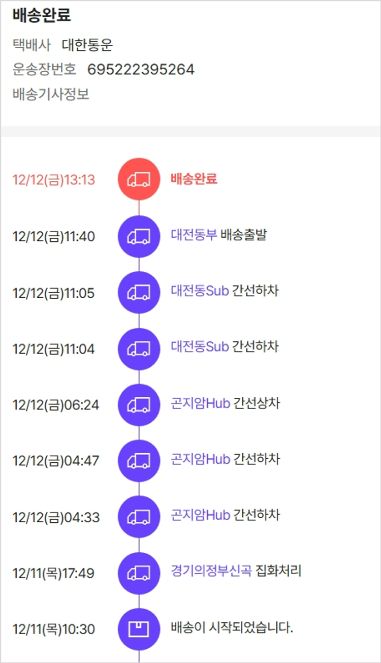 기부자님이 사용한 기부포인트 13,100원, 결제 수수료 11,575원, 기타 사업비는 행복나눔재단이 부담했습니다. (기부후기 발송시점에 최종 업데이트 됩니다.) 실제 쇼핑몰에서 확인되는 배송현황을 캡처한 내용입니다. 실시간 자료와는 차이가 있을 수 있습니다.