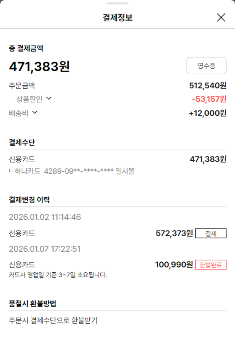 물품배송비 18,000원, 가격상승분 1,435원, 100원 미만 지원금 90원, 기타 사업비는 행복나눔재단이 부담했습니다. (기부후기 발송시점에 최종 업데이트 됩니다.) 상품 주문 건 중 품절 발생하여 2026-01-07 재주문하였습니다. 실제 쇼핑몰에서 확인되는 배송현황을 캡처한 내용입니다. 실시간 자료와는 차이가 있을 수 있습니다.