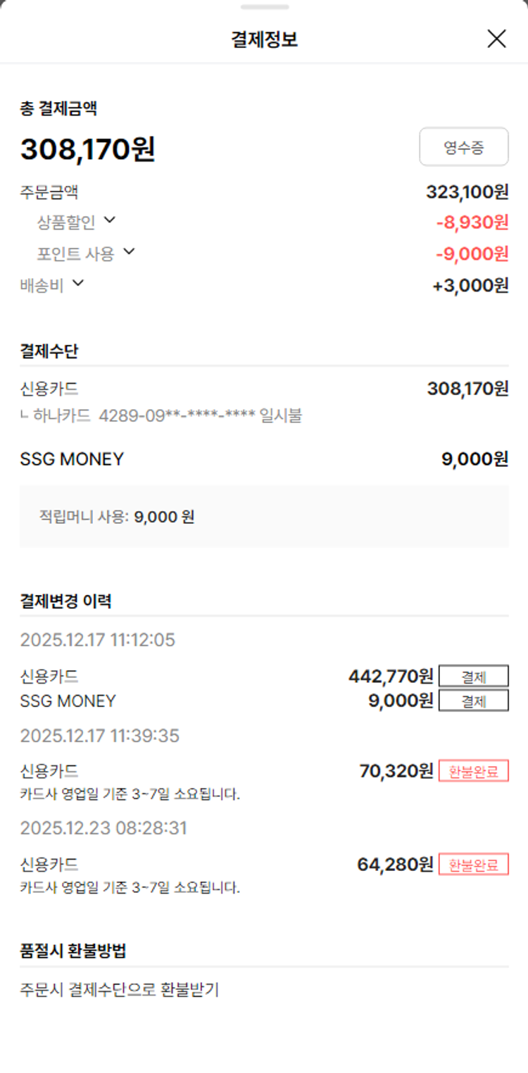 기부자님이 사용한 기부포인트 23,000원, 가격상승분 13,310원, 100원 미만 지원금 20원, SSG 머니 9,000포인트, 결제 수수료 12,058원, 기타 사업비는 행복나눔재단이 부담했습니다. (기부후기 발송시점에 최종 업데이트 됩니다.) 상품 주문 건 중 품절 발생하여 2025-12-23 재주문하였습니다. 실제 쇼핑몰에서 확인되는 배송현황을 캡처한 내용입니다. 실시간 자료와는 차이가 있을 수 있습니다.