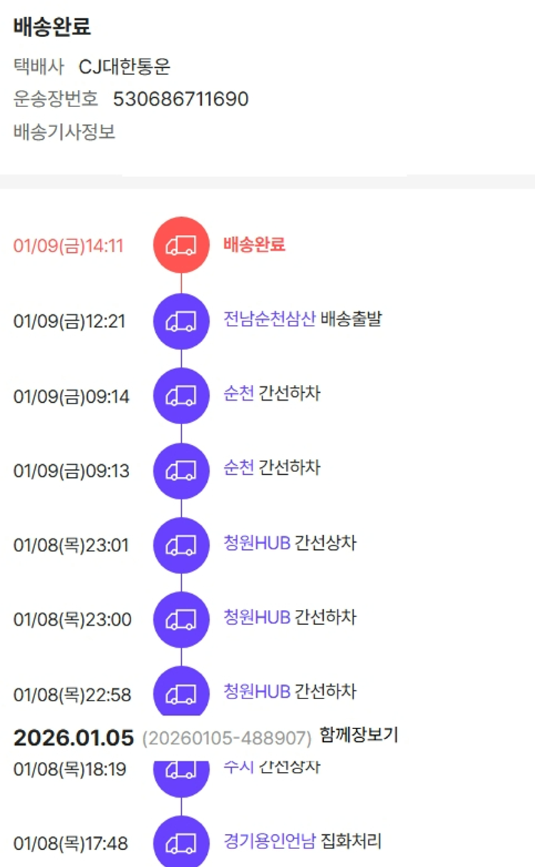 물품배송비 4,000원, 가격상승분 4,264원, 100원 미만 지원금 89원, 기타 사업비는 행복나눔재단이 부담했습니다. (기부후기 발송시점에 최종 업데이트 됩니다.) 상품 주문 건 중 품절 발생하여 2026-01-08 재주문하였습니다. 실제 쇼핑몰에서 확인되는 배송현황을 캡처한 내용입니다. 실시간 자료와는 차이가 있을 수 있습니다.
