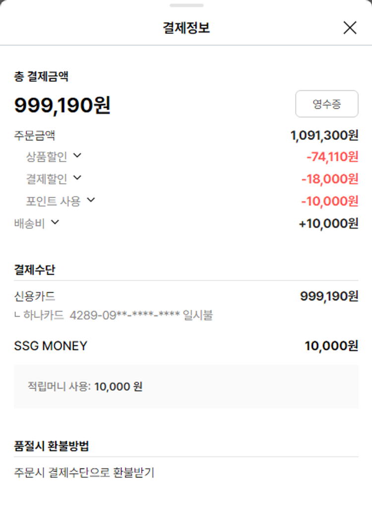 가격상승분 4,056원, 100원 미만 지원금 34원, SSG 머니 10,000포인트, 기타 사업비는 행복나눔재단이 부담했습니다. (기부후기 발송시점에 최종 업데이트 됩니다.) 실제 쇼핑몰에서 확인되는 배송현황을 캡처한 내용입니다. 실시간 자료와는 차이가 있을 수 있습니다.