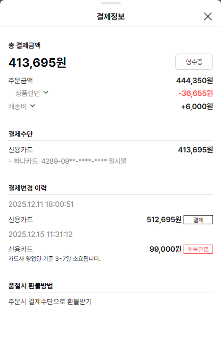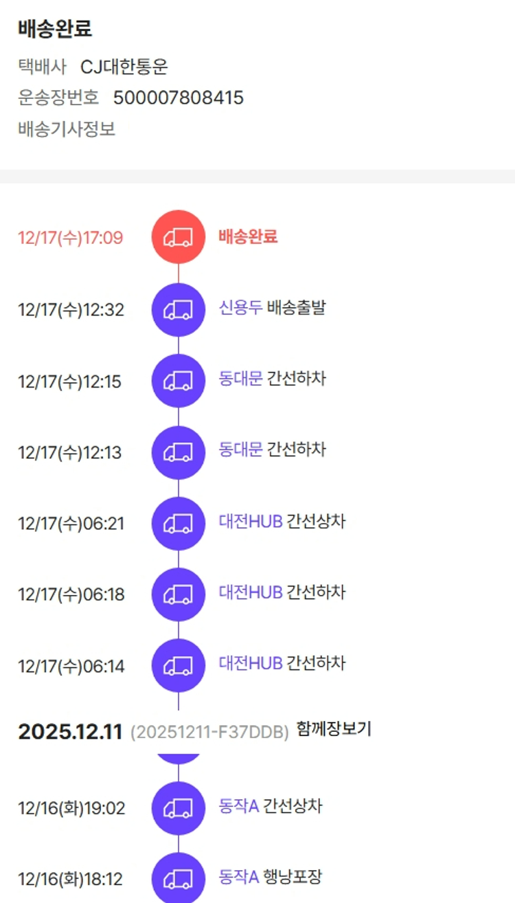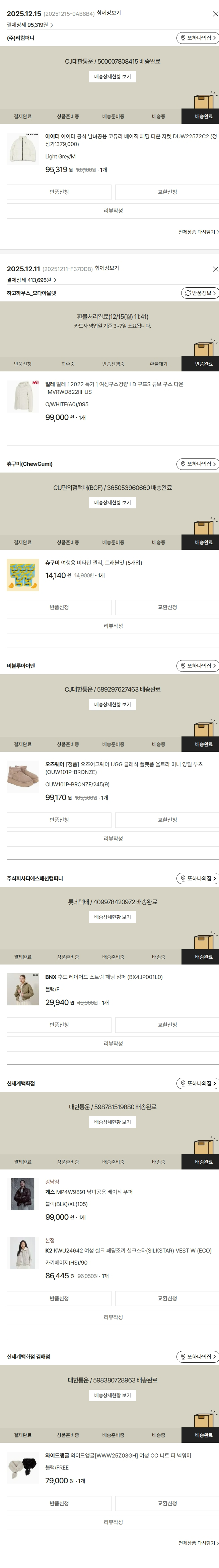 물품배송비 6,000원, 가격상승분 6,959원, 100원 미만 지원금 55원, 기타 사업비는 행복나눔재단이 부담했습니다. (기부후기 발송시점에 최종 업데이트 됩니다.) 상품 주문 건 중 품절 발생하여 2025-12-15 재주문하였습니다. 실제 쇼핑몰에서 확인되는 배송현황을 캡처한 내용입니다. 실시간 자료와는 차이가 있을 수 있습니다.
