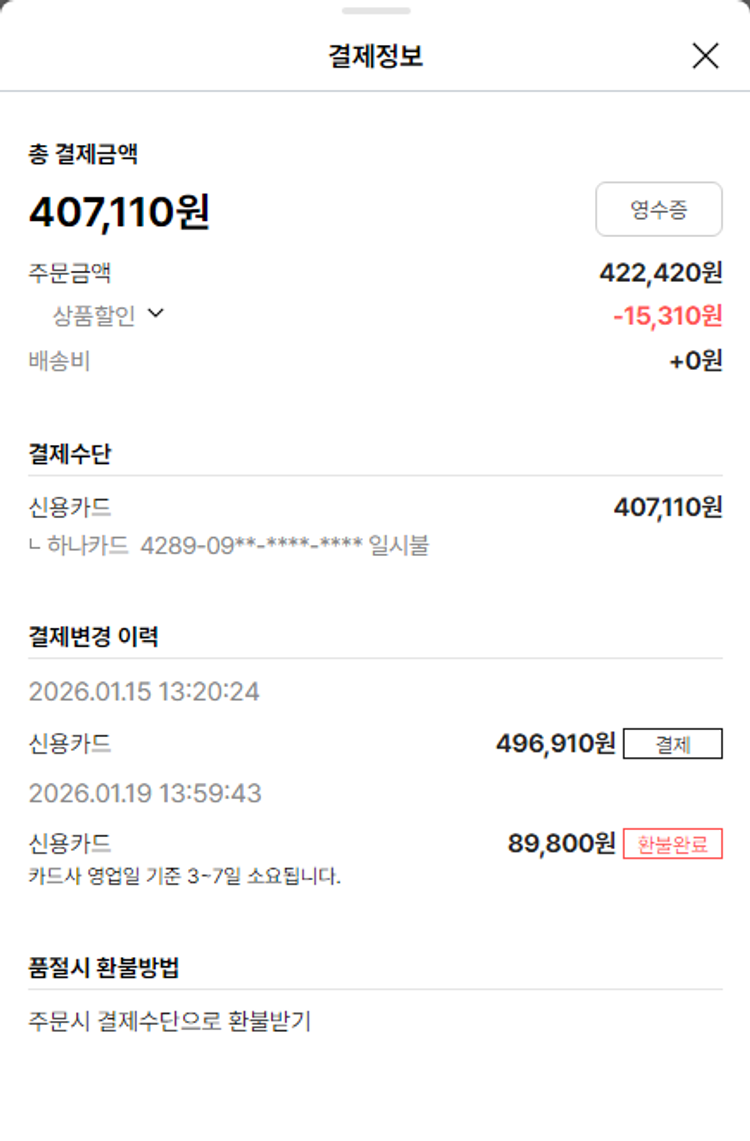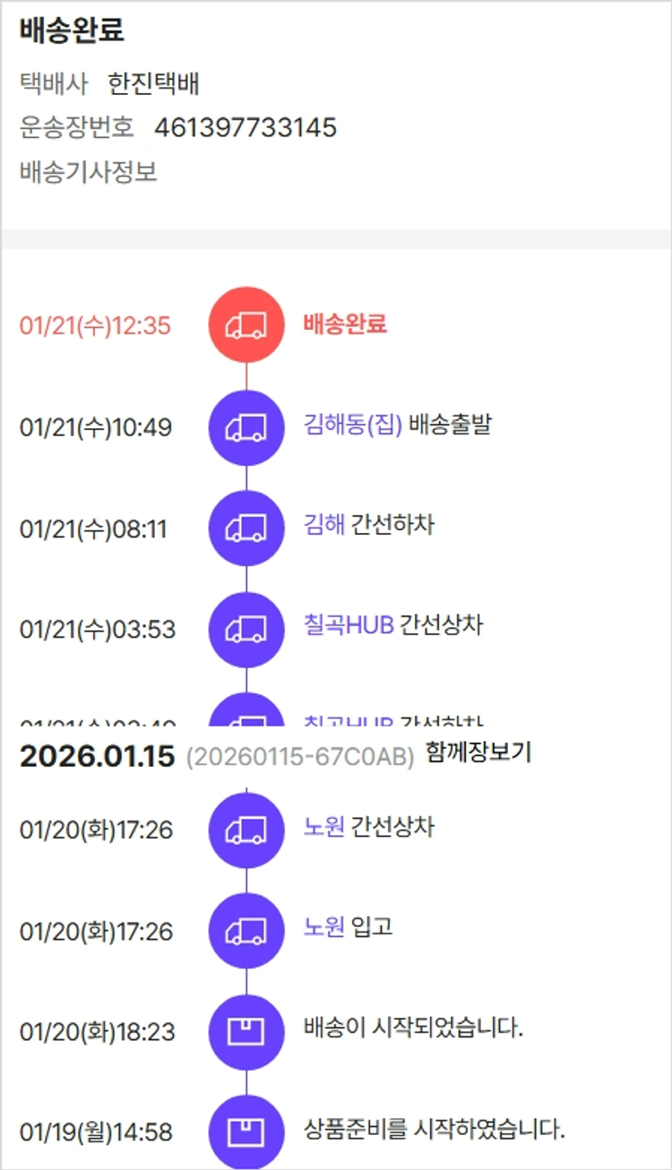 기부자님이 사용한 기부포인트 2,000원, 가격상승분 902원, 100원 미만 지원금 8원, 결제 수수료 10,831원, 기타 사업비는 행복나눔재단이 부담했습니다. (기부후기 발송시점에 최종 업데이트 됩니다.) 상품 주문 건 중 품절 발생하여 2026-01-19 재주문하였습니다. 실제 쇼핑몰에서 확인되는 배송현황을 캡처한 내용입니다. 실시간 자료와는 차이가 있을 수 있습니다.
