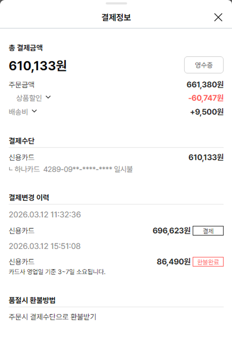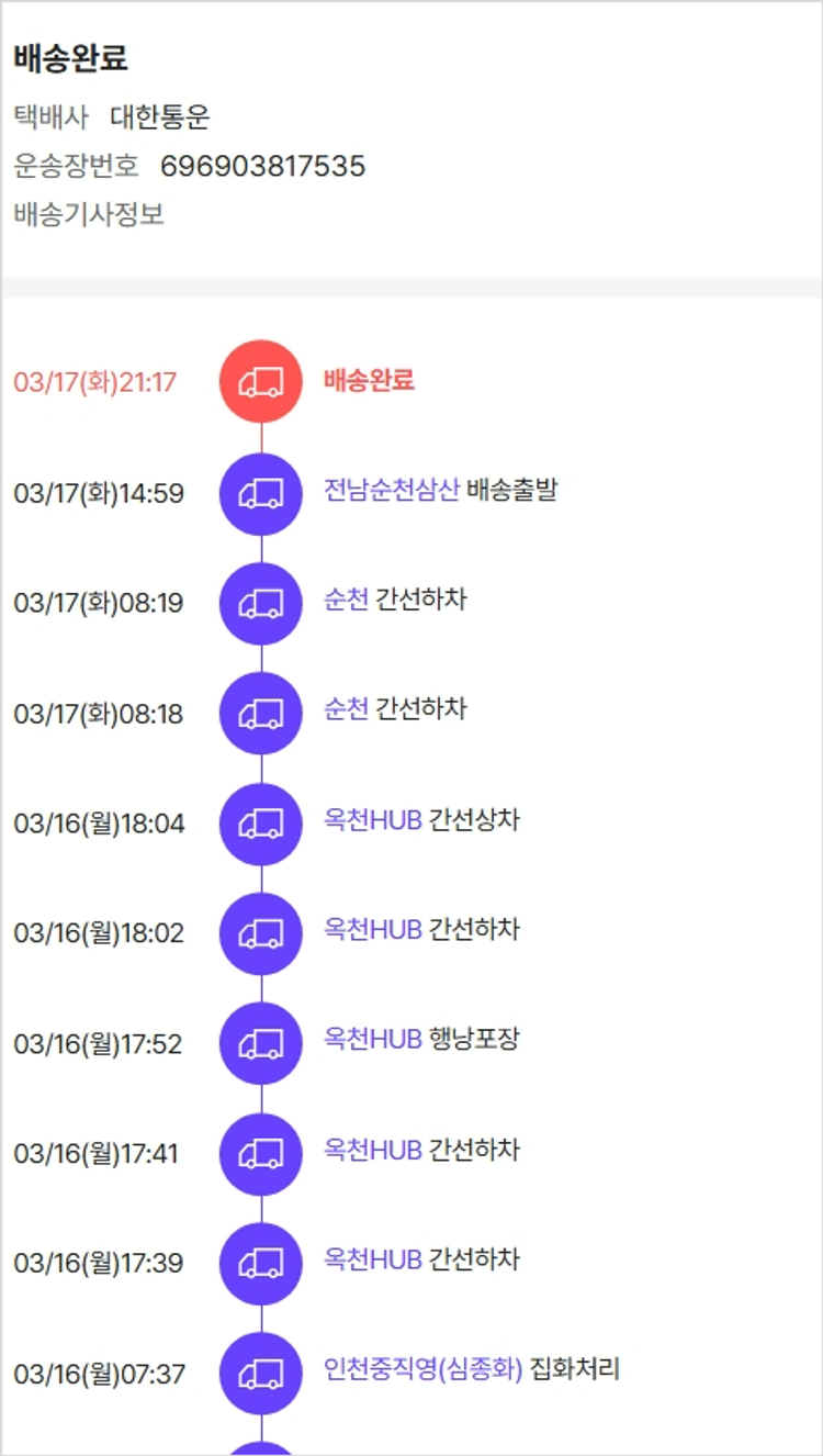 물품배송비 9,500원, 가격상승분 5,370원, 100원 미만 지원금 43원, 결제 수수료 15,815원, 기타 사업비는 행복나눔재단이 부담했습니다. (기부후기 발송시점에 최종 업데이트 됩니다.) 상품 주문 건 중 품절 발생하여 2026-03-12 재주문하였습니다. 실제 쇼핑몰에서 확인되는 배송현황을 캡처한 내용입니다. 실시간 자료와는 차이가 있을 수 있습니다.