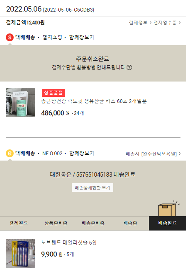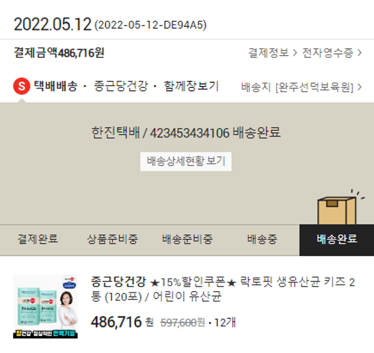 기부자님이 사용한 기부포인트 11,500원, 물품배송비 2,500원, 결제 수수료 11,838원, 기타 사업비는 행복나눔재단이 부담했습니다. (기부후기 발송시점에 최종 업데이트 됩니다.) 실제 쇼핑몰에서 확인되는 배송현황을 캡처한 내용입니다. 실시간 자료와는 차이가 있을 수 있습니다.