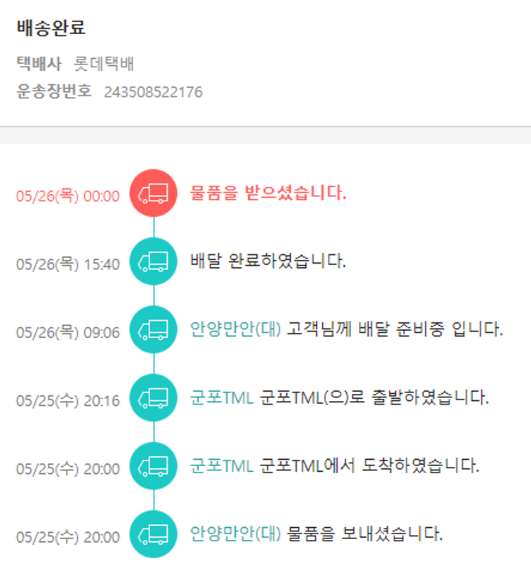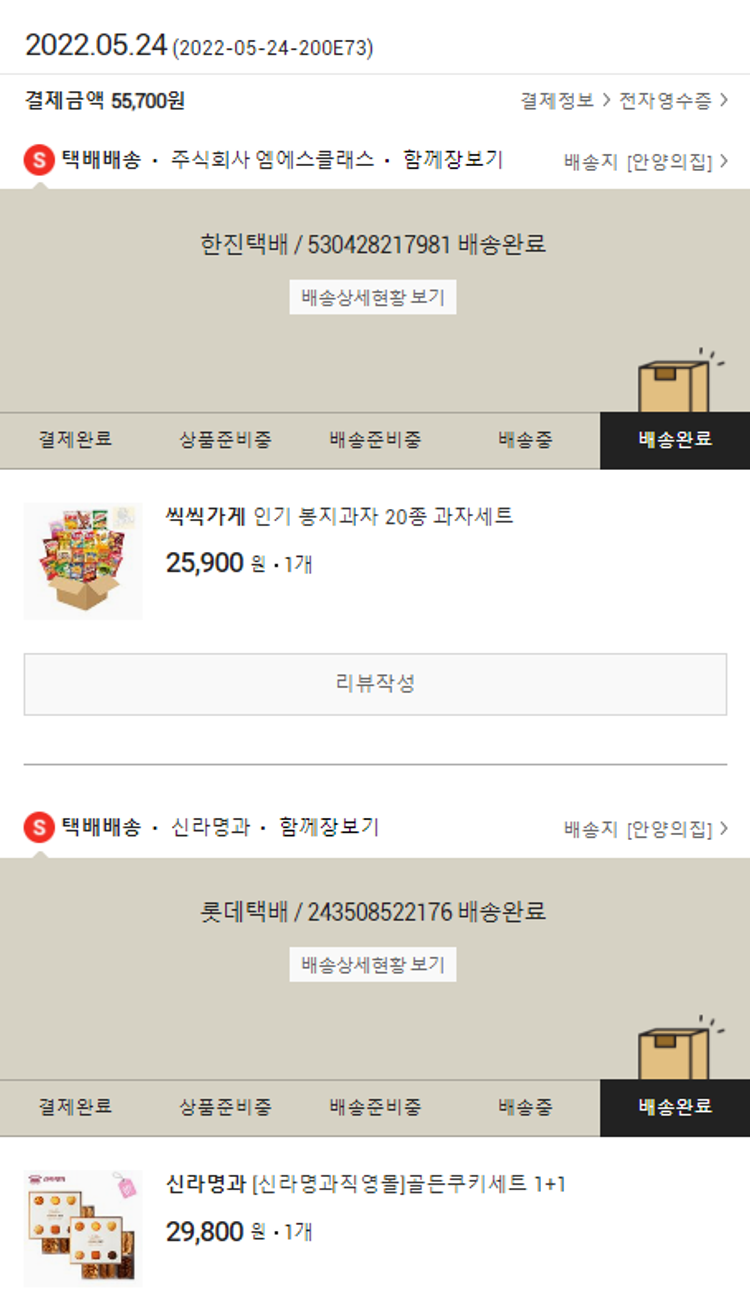 기부자님이 사용한 기부포인트 55,600원, 기타 사업비는 행복나눔재단이 부담했습니다. (기부후기 발송시점에 최종 업데이트 됩니다.) 실제 쇼핑몰에서 확인되는 배송현황을 캡처한 내용입니다. 실시간 자료와는 차이가 있을 수 있습니다.
